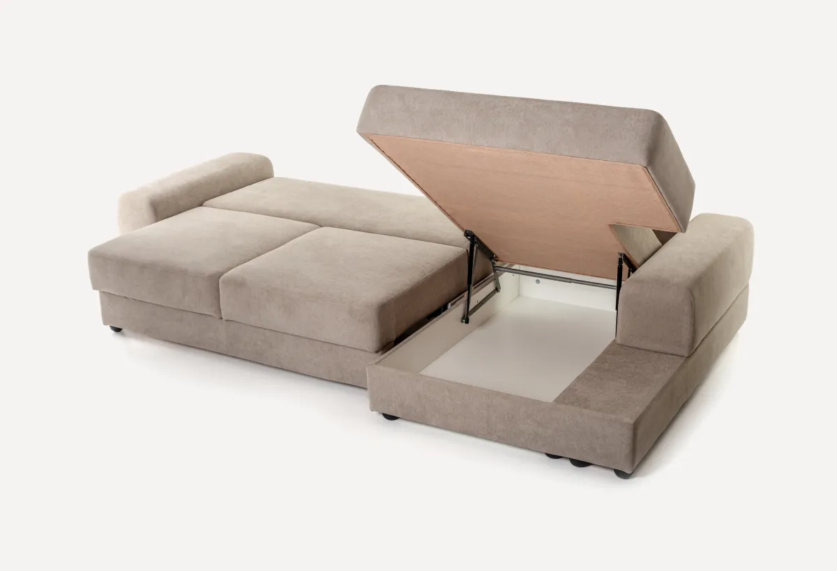 Диван средний (без подлокотника)Самый ходовой модуль. У него уже есть механизм трансформации — пантограф. Это значит, что спальное место выдвигается легко, без лишних усилий. Внутри — ящик для белья. Ставится в центр композиции.